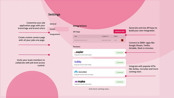 Hirevire integrates seamlessly with various platforms to enhance your recruitment process. This includes integrations with LinkedIn, Make, Webhooks, Zapier, and ATS like Ashby and Recruitee.