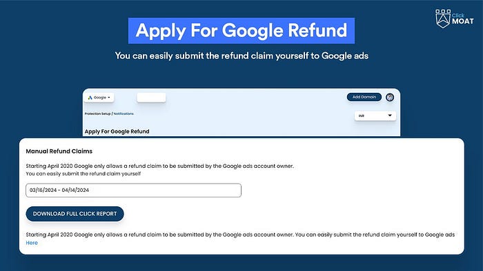 ClickMoat also helps in generating reports and submitting claims for refunds on fraudulent ad clicks, ensuring you get back the money lost to click fraud.