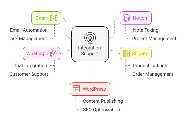 - API Integrations: Connect with Gmail, Notion, Shopify, WhatsApp, WordPress, and more.